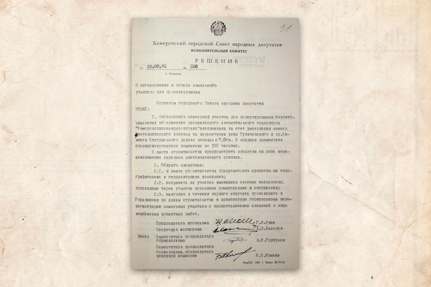 В этот день принято решение о согласовании и отводе земельного участка для проектирования автовокзала за счет уменьшения земель цветоводческого совхоза